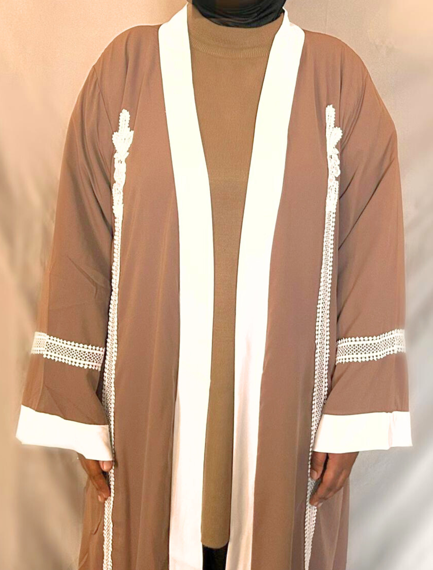 Ce kimono élégant en soie de médine marron et blanc avec ceinture, taille unique (36-46), mesure 145cm de long. Polyvalent, il peut se porter avec l'ensemble marron comme sur l'image ou avec toute autre tenue. Fabriqué en soie de qualité, il offre un confort et une élégance incomparables.